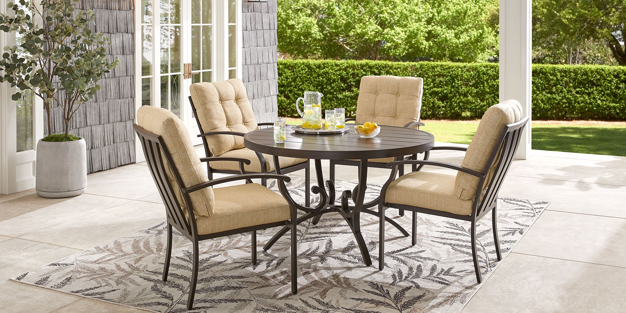 5 out of 5 stars, based on 2 reviews 2 ratings current price $239.00 $ 239. Our 42″ round table sets are the most popular and weighs a total weight of 1,600 lbs of solid cement. Light brown round metal outdoor side table. Sold by ami ventures inc. The table top and table top pedestal have been manufactured with a 2.25″ hole in the center to accommodate a standard patio umbrella. Round outdoor dining sets : At the end of the year, be sure to protect your new outdoor dining chairs with weatherproof outdoor furniture covers. Brown round wicker outdoor patio table with glass top and steel frame. Provide the perfect way to enjoy a great meal outdoors surrounded by natural beauty. By kadehome (2) $ 826 88 /box. Whether you have a smaller sized patio or a whole backyard, we offer a variety of styles and shapes to suit your entertaining needs. By polywood (3) 28 in. 4.3 out of 5 stars with 12 ratings.